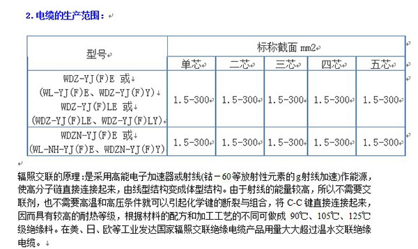 辐照交联低烟无卤聚乙烯电力电缆参照标准:GB/T12706-2002,GB12666-90标准4·额定电压:0.6/1KV4·长期工作温度:电缆导体允许长期工作温度135℃+·电缆导体的短路温度:可达280℃,持续时间可达5分钟+·弯曲半径电缆敷设时的弯曲半径:单芯≥20倍电缆的外径;多芯≥15倍电缆外径+·环境温度电缆敷设时的环境温度为-40℃'·电缆燃烧时的透光率达到97%,无HCL腐蚀气体释放(气体PH值为6.74)41.电缆的型号和名称:型号。名称。主要用途。敷设在室内外,可经受一定的敷设牵引、但不能承受机械外力作用的场合;单芯电缆不允许敷设在磁性管道中。铜芯辐照交联低烟无卤阻燃聚乙烯绝缘低烟无卤阻燃聚乙烯护套电力电缆。WDZ-YJ(F)E或+(WL-YJ(F)E、+WDZ-YJ(F)Y)。敷设在室内外,可经受一定的敷设牵引、但不能承受机械外力作用的场合;单芯电缆不允许敷设在磁性管道中。铜芯辐照交联低烟无卤阻燃聚乙烯绝缘低烟无卤阻燃聚乙烯护套耐火电力电缆。WDZN-YJ(F)E或(WL-NH-YJ(F)E、WDZN-YJ(F)Y)
